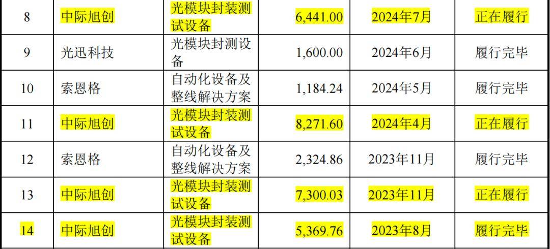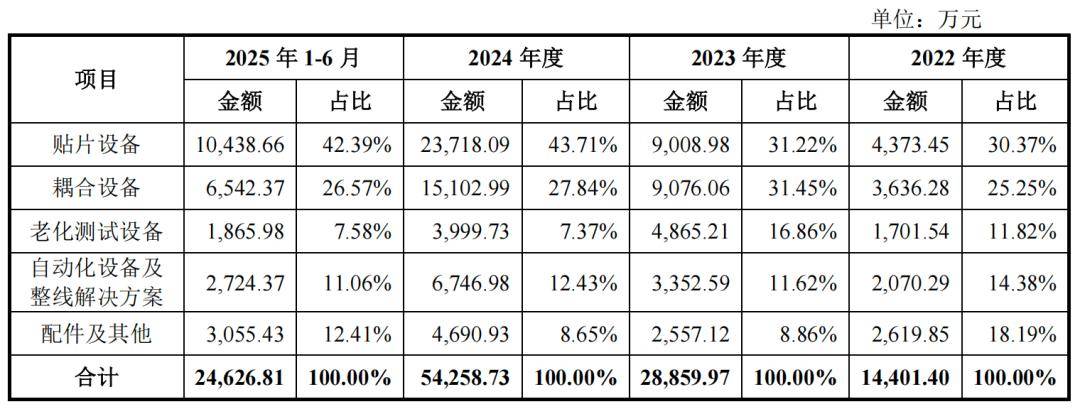 期间,中际旭创一曲位列猎奇智能第一大客户,次要采办光模块封拆测试设备,62。19%、58。85%、65。55%的发卖收入,对应金额8281。53万元、1。80亿元、3。19亿元、1。61亿元。2023年和2024年增速别离为117。17%,77。22%。2024年,中际旭创对猎奇智能采购规模增速大幅放缓40个百分点,猎奇智能营收规模增速同比下滑近12个百分点。依托取中际旭创的合做经验,猎奇智能还将设备处理方案推广至其他光模块厂商,进一步拓展市场份额,逐渐确立正在光模块封测老化设备范畴的领先地位。2024年,猎奇智能光模块贴片设备市场份额排名全球第一,光模块耦合设备市场份额排名全球第二。其光模块封拆测试设备客户还包罗光迅科技、源杰科技、陕西电子等,但取中际旭创比拟,这些客户业绩贡献规模相对无限。按照产物类别分歧,猎奇智能次要产物包罗贴片设备、耦合设备、老化测试设备、从动化设备及整线处理方案、配件及其他。此中中高精度共晶和固晶贴片设备、耦合设备和老化测试设备,笼盖光模块封拆测试流程从物理封拆到最终机能验证的多个次要焦点环节,支撑最高1。6T速度光模块的封拆需求,