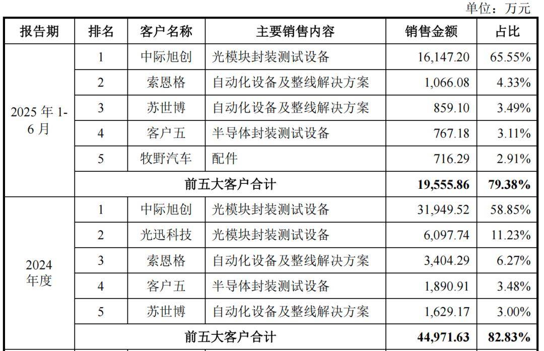 各期,猎奇智能从停业务收入中,有67。44%、79。53%、78。92%、76。54%来自贴片设备、耦合设备、老化测试设备的贡献。此中贴片设备、耦合设备发卖收入呈快速增加态势,出格是贴片设备,2023年和2024年发卖收入同比别离增加105。99%、163。27%,跨越同期99。47%、87。74%的营收增速,从停业务业绩贡献占比从2022年的30。37%增至2024年的43。71%。同时,猎奇智能逐渐向半导体行业其他范畴拓展,实现向“客户五”等射频行业出名客户批量供货,其研发的碳化硅(SiC)预烧结设备已通过士兰微验证。2022年-2024年,猎奇智能来自“客户五”的收入别离为796。02万元、3273。09万元、1890。91万元、767。18万元,次要为发卖半导体封拆测试设备。2025年2月,又取“客户五”签下了640。03万元的光模块封拆测试设备合同。各期,猎奇智能还有部门收入来自从动化设备及整线处理方案、配件及其他,不外合计收入占比从2022年的32。57%下降至2024年的21。08%。其从动化设备及整线处理方案营业次要包罗汽车、光通信等范畴的各类从动化设备,次要客户包罗索恩格、苏世博等,配件客户次要为牧野汽车。各期,猎奇智能别离有81。79%、93。17%、82。83%、79。38%的收入集中于前五大客户,取下逛光模块行业合作款式较为集中的成长示状相分歧。