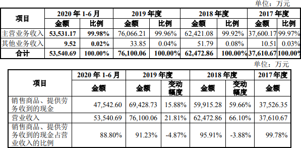 2017年至2020年1-6月,怡合达停业收入别离为3。76亿元、6。25亿元、7。61亿元、5。35亿元,从停业务收入别离为3。76亿元、6。24亿元、7。61亿元、5。35亿元,发卖商品、供给劳务收到的现金别离为3。75亿元、5。99亿元、6。94亿元、4。75亿元。