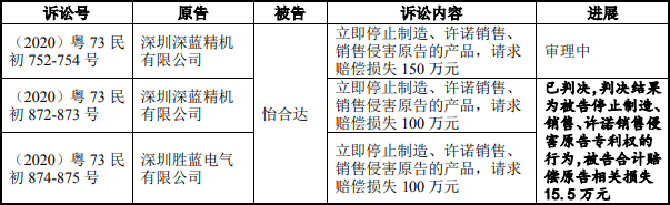 (2020)粤73平易近初752-754号案件诉讼:深圳深蓝精机无限公司诉公司侵害外不雅设想专利权胶葛一案由广州学问产权法院受理,被告认为被告未经许可私行实施被告专利向法院从意判令被告当即遏制制制、许诺发卖、发卖侵害被告相关外不雅设想专利权的端子台产物,并合计从意向其补偿经济丧失150万元。截至本答复出具之日,该案件尚正在审理过程中。(2020)粤73平易近初872-873号案件诉讼:深圳深蓝精机无限公司诉公司侵害外不雅设想专利权胶葛一案由广州学问产权法院受理,被告认为被告未经许可私行实施被告专利向法院从意判令被告当即遏制制制、许诺发卖、发卖侵害被告相关外不雅设想专利权的端子台产物,并合计从意向其补偿经济丧失100万元。截至本答复出具之日,该案一审讯决生效,判决成果为公司当即遏制制制、许诺发卖、发卖侵害被告相关外不雅设想专利权的端子台产物,并补偿被告合理费用合计8万元,公司已领取上述费用。(2020)粤73平易近初874-875号案件诉讼:深圳胜蓝电气无限公司诉公司侵害外不雅设想专利权胶葛一案由广州学问产权法院受理,被告认为被告未经许可私行实施被告专利向法院从意判令被告当即遏制制制、许诺发卖、发卖侵害被告相关外不雅设想专利权的端子台产物,并合计从意向其补偿经济丧失100万元。截至本答复出具之日,该案一审讯决生效,判决成果为公司当即遏制制制、许诺发卖、发卖侵害被告相关外不雅设想专利权的端子台产物,并补偿被告合理费用合计7。5万元,公司已领取上述费用。深圳深蓝精机无限公司取深圳胜蓝电气无限公司为统一现实节制人节制的两家公司,上述诉讼所涉专利产物为被告取得的具有相关外不雅设想专利权的端子台产物。演讲期内,取上述诉讼涉及的产物发卖收入别离为0。43万元、2。55万元、0。36万元、1。96万元,占公司同期停业收入比例低于0。01%。截至本答复出具之日,公司已遏制采购或发卖取上述诉讼相关的产物。招股书显示,怡合达配合实控人之一金立国曾参股的昆山怡合达从动化设备无限公司(以下简称“昆山怡合达”)于2018年5月,因犯虚开公用罪,判惩罚金人平易近币二十万元,上述惩罚对象不涉及公司、公司现实节制人无关。金立国此前曾持有昆山怡合达20%股份并担任监事,2016年9月让渡其股权,昆山怡合达后于2019年9月登记。